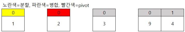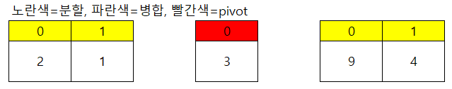 4. 9를 pivot으로 잡아 왼쪽 리스트와 오른쪽 리스트로 분할(9보다 큰 수가 없기 때문에 오른쪽 리스트는 없음)